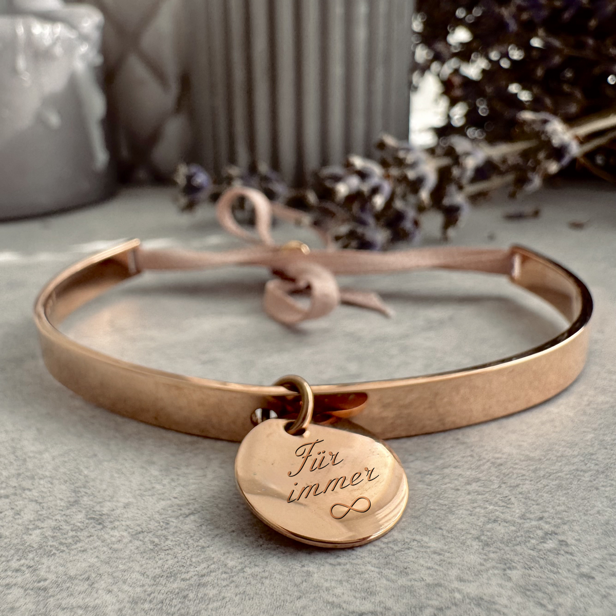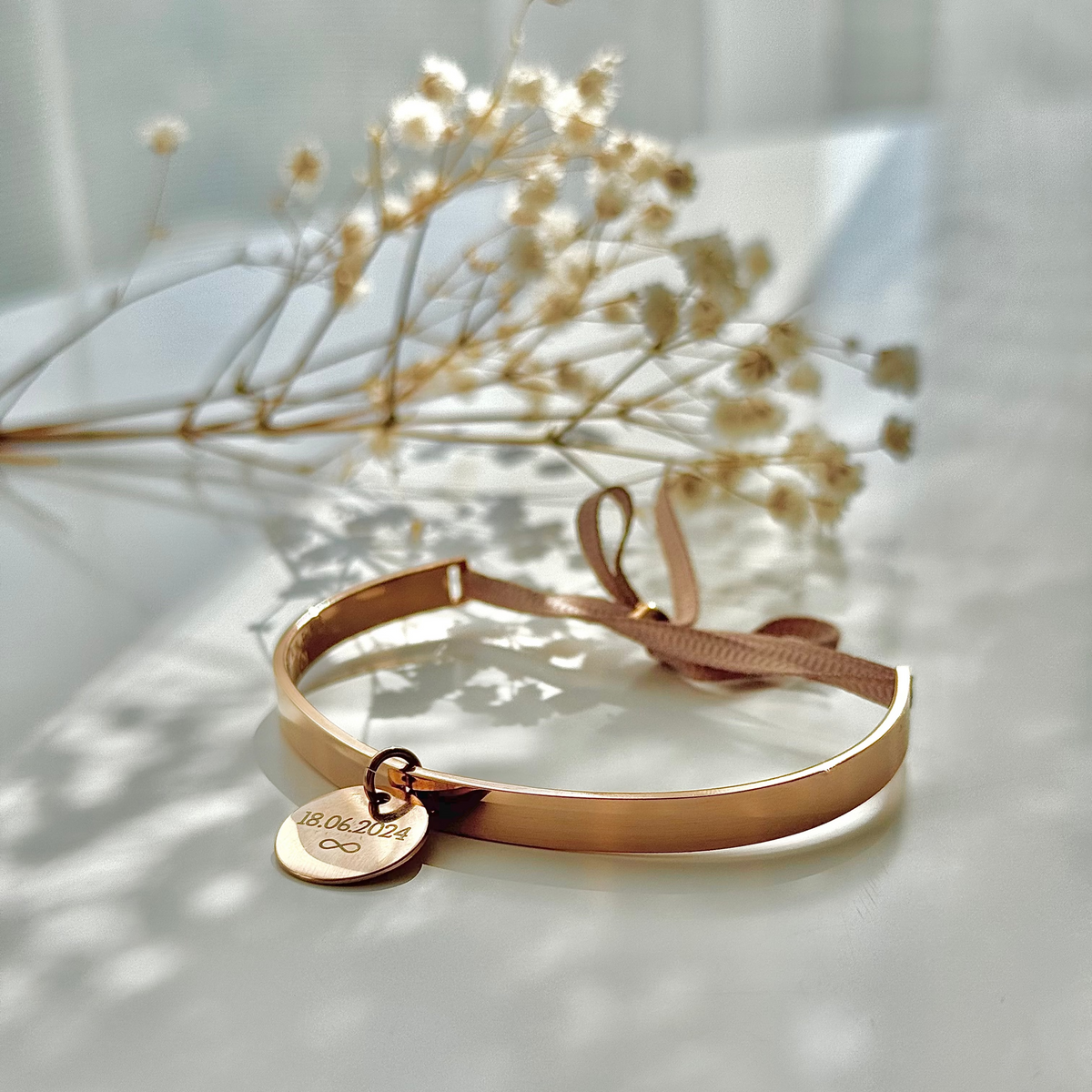 Gefertigt aus hochwertigem Edelstahl und veredelt mit einem feinen Satinband in zartem Grau, schmiegt sich dieses Schmuckstück harmonisch an dein Handgelenk.